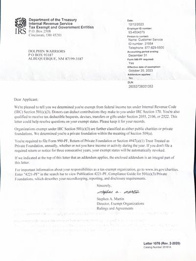 The included letter from the Internal Revenue Service certifies that Dolphin Warriors has been recognized as a tax-exempt public charity under section 501(c)(3) of the Internal Revenue Code. This letter serves as legal documentation of the organization's status as a registered non-profit entity.